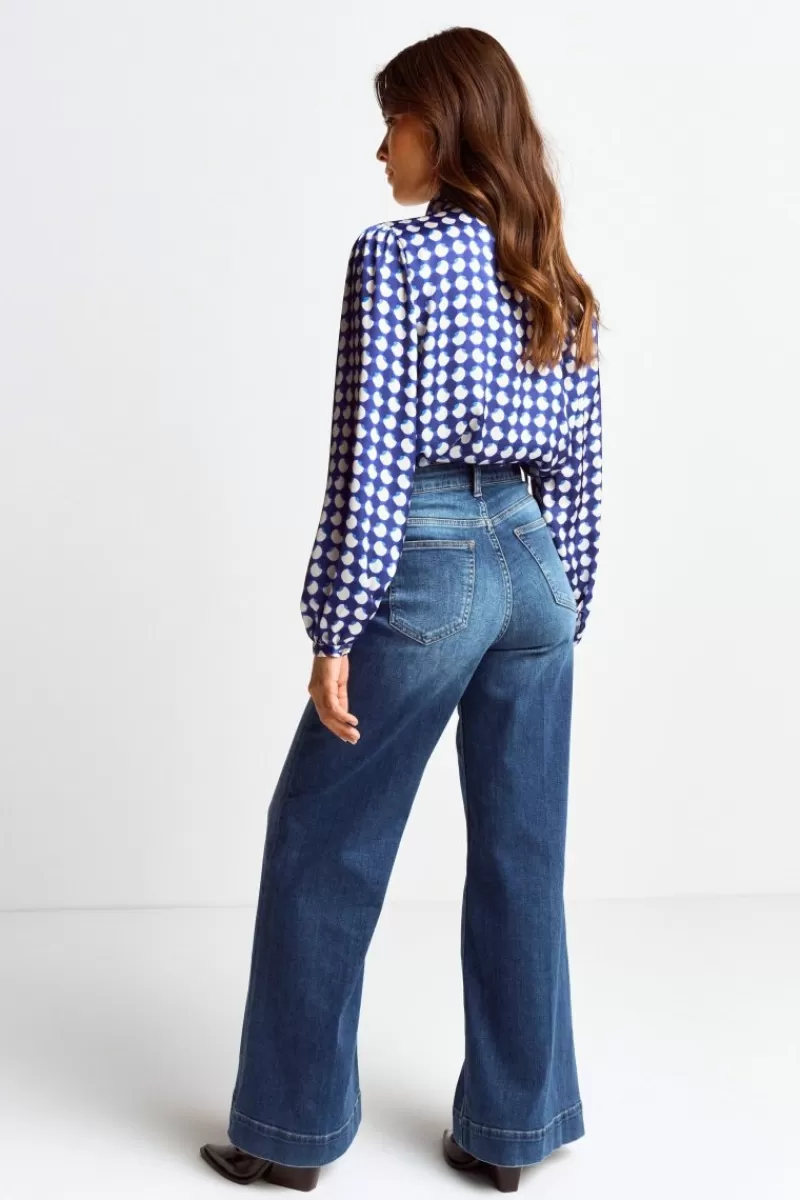 Diese gemusterte Schluppenbluse in Blau mit Frill-Kragen und weißen Punkten ist ein Must-have für elegante Looks! Der leicht glänzende Stoff und der raffinierte Schnitt verleihen Deinem Outfit einen extravaganten Touch.
